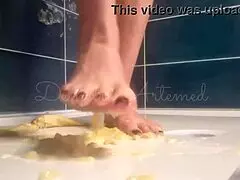 Polish woman crushes banana with bare feet.