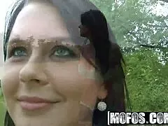 ¡Mira a esta morena relajada con gafas mostrando tetas por plata al aire libre!