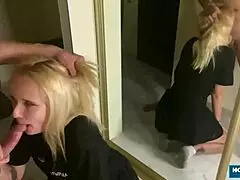 Sluty-eyed blonde in thong asks, wanna see me swallow? She deepthroats cum with pure hunger.