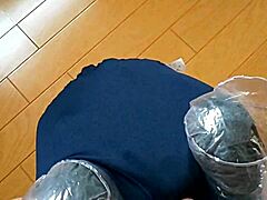 Under the desk view of tight japanese ayame's ass and socks in gym uniform on webcam solo