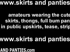 Teen babe shakes her little ass in micro skirt. She flashes panties in upskirt view.