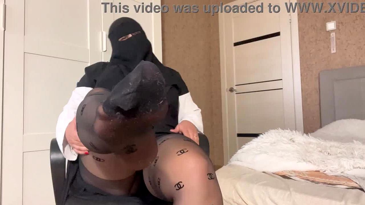 Stepmom in hijab is showing off her pantyhose to stepson in a teasing way