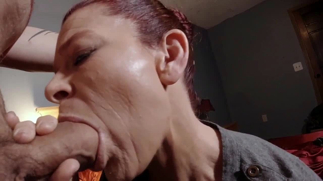 Redhead wife throats neighbors big cock rough with deep gagging choking face fucking until creampie and facial cumshot