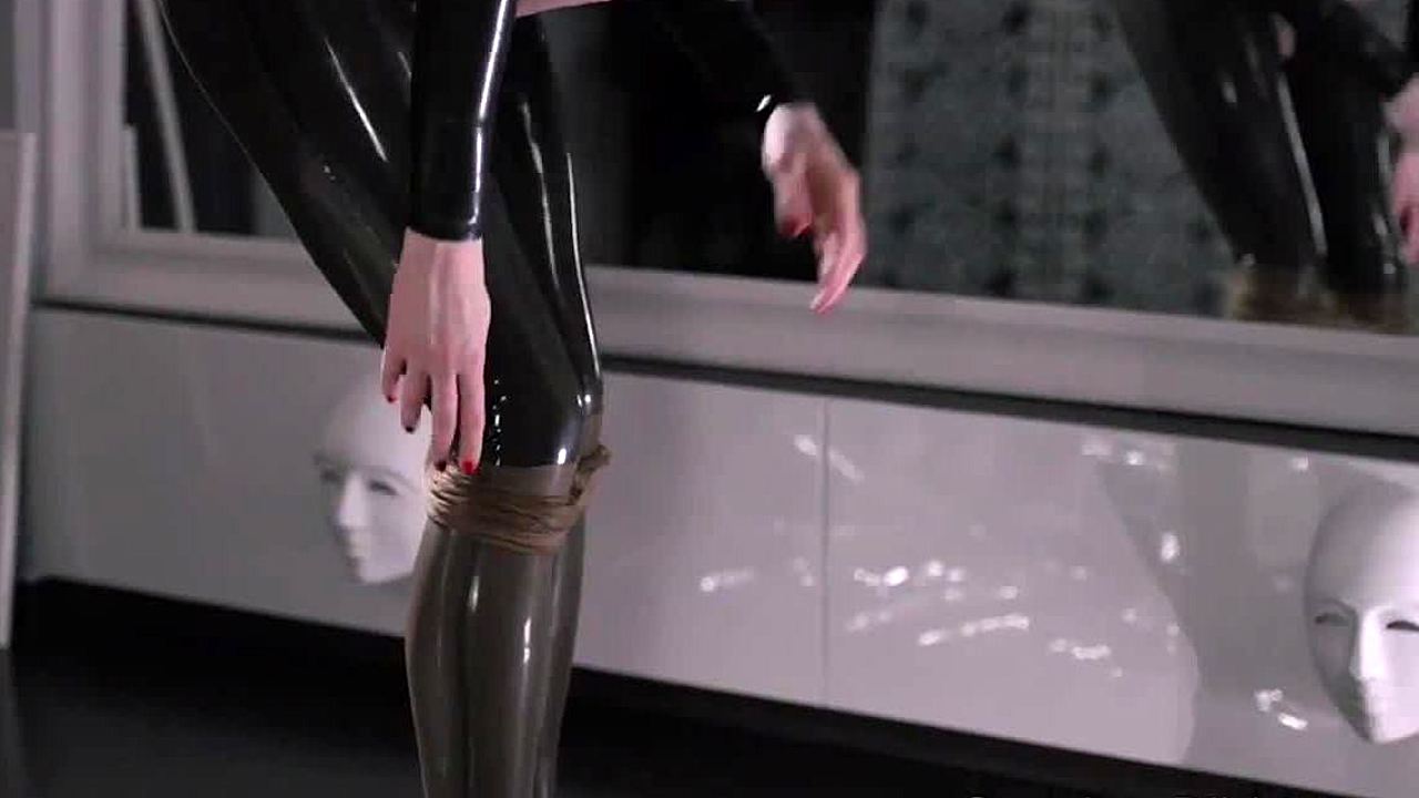 Hey, wanna see this blonde in latex pegging a bound guy hard?
