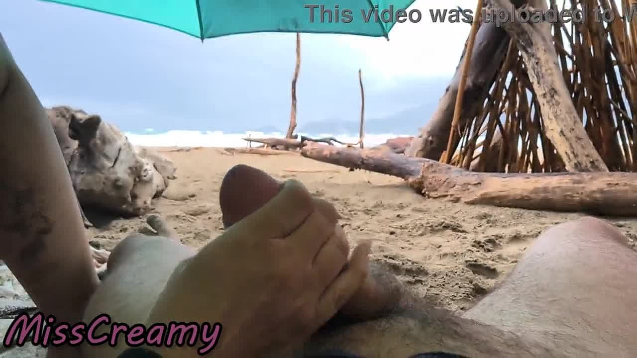 Misscreamy's stormy beach handjob strokes cock to orgasm in 4k public sex