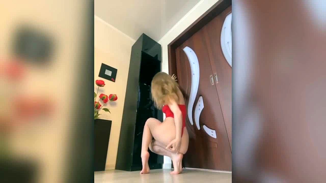 Saftige petite 18+ Blondine MILF zieht sich nackt aus, zeigt ihren geilen Arsch im Solo Striptease.